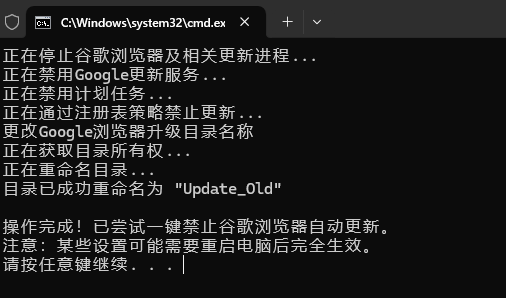 重启是必须的,否则无法正常安装旧版谷歌浏览器! 3、下载并安装旧版谷歌浏览器安装程序 谷歌浏览器旧版安装程序:GoogleChrome109.0.5414.75x86Enterprise.rar:地址1、地址2 执行压缩包中的文件:GoogleChrome109.0.5414.75x86Enterprise.msi,安装完毕后,切勿立即运行谷歌浏览器,要执行完下面这个禁止谷歌浏览器更新脚本后才执行。 4、执行一键禁止谷歌浏览器自动更新bat脚本文件 直接下载:禁止Chrome浏览器更新.rar 解压文件到磁盘上,鼠标右键点击以管理员身份执行: