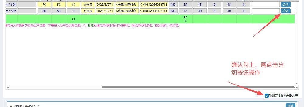 进入入库页面,选择对应的仓位,点击明细后面的分切按钮(注意不要修改默认的长宽),有几个规格点击分切几次