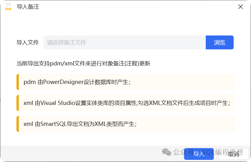 - • 备注更新功能:通过“导入备注”功能可以直接从 PowerDesigner 导出的 PDM 文件或者 Visual Studio 生成的 XML 文件中导入表列注释,实现数据库设计文档与代码的无缝同步。