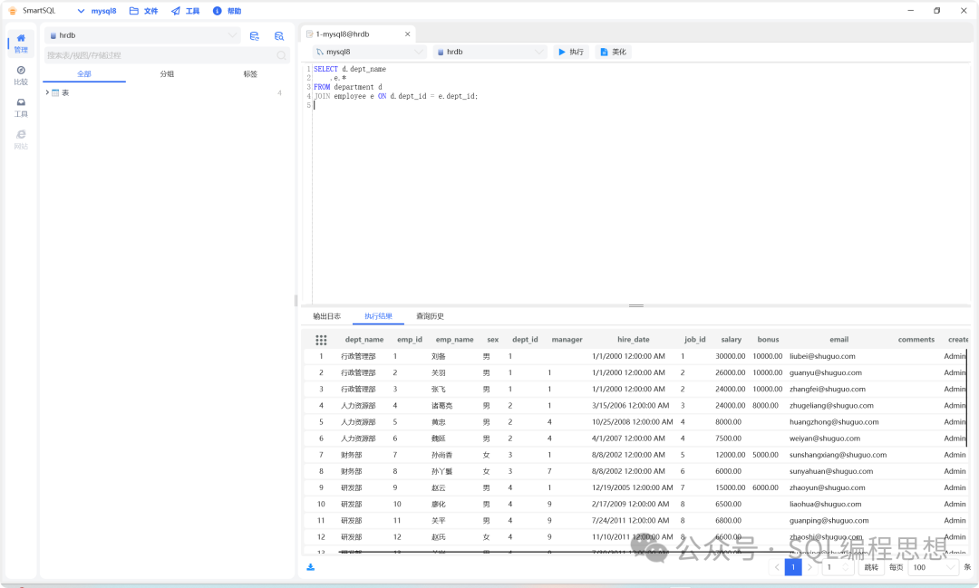 - • 数据查询功能:SmartSQL 还提供了一个简单的数据查询界面,支持语法高亮、格式化、查询历史等功能。
