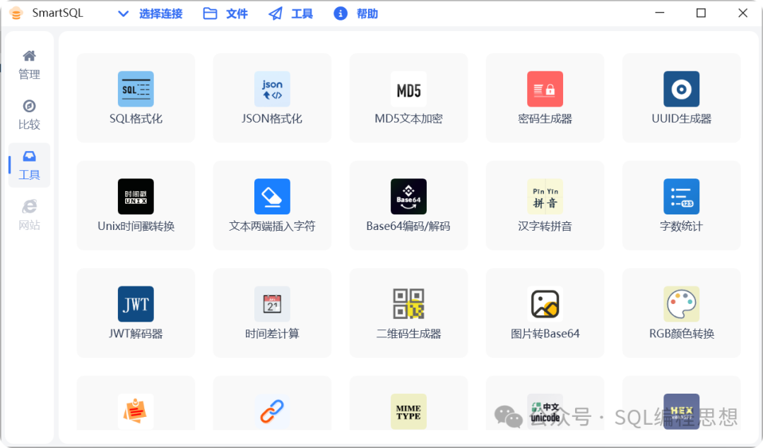 - • 辅助工具:SmartSQL 提供了一些辅助开发工具,例如 UUID 生成器、JSON 格式化、Base64 编码/解码等,方便日常使用。