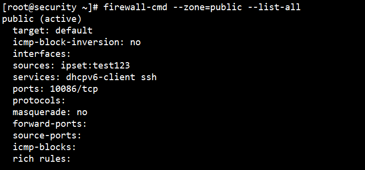 创建一条引用的策略 重新载入防火墙配置启用这条策略 然后使用firewalld --get-ipsets就可以看到 ![]() 看下这个地址组里面有那些地址 ![]() 看看public这个区域的策略情况 ![]() 大家可能也注意到了,我们上述添加策略时只用了一部分参数,例如区域、源地址或者目的端口,那么为啥源地址和源端口不一起用呢,那是因为firewalld默认上同时只支持一个参数的变化,两个参数会造成互斥,不像iptables可以加一条参数,有许多参数,当然firewalld也有办法添加多个参数的策略,那就是“富规则”。 该文章在 2025/9/16 12:04:59 编辑过 |