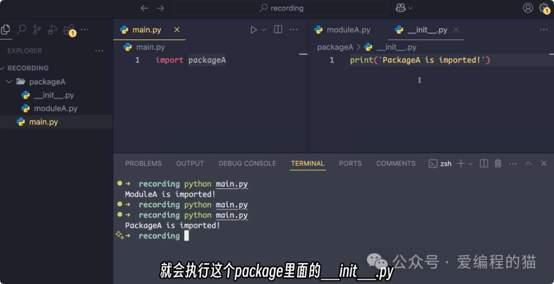 __init__.py后:导入语句正常执行,证明包的身份已被识别。