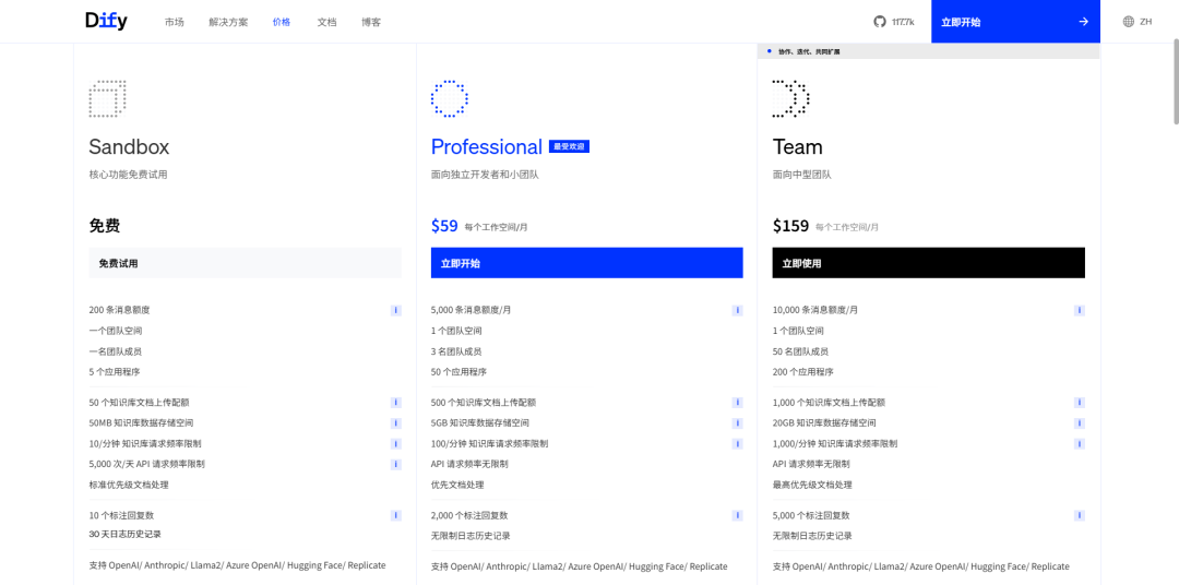 详情见官网计价: https://dify.ai/zh/pricing