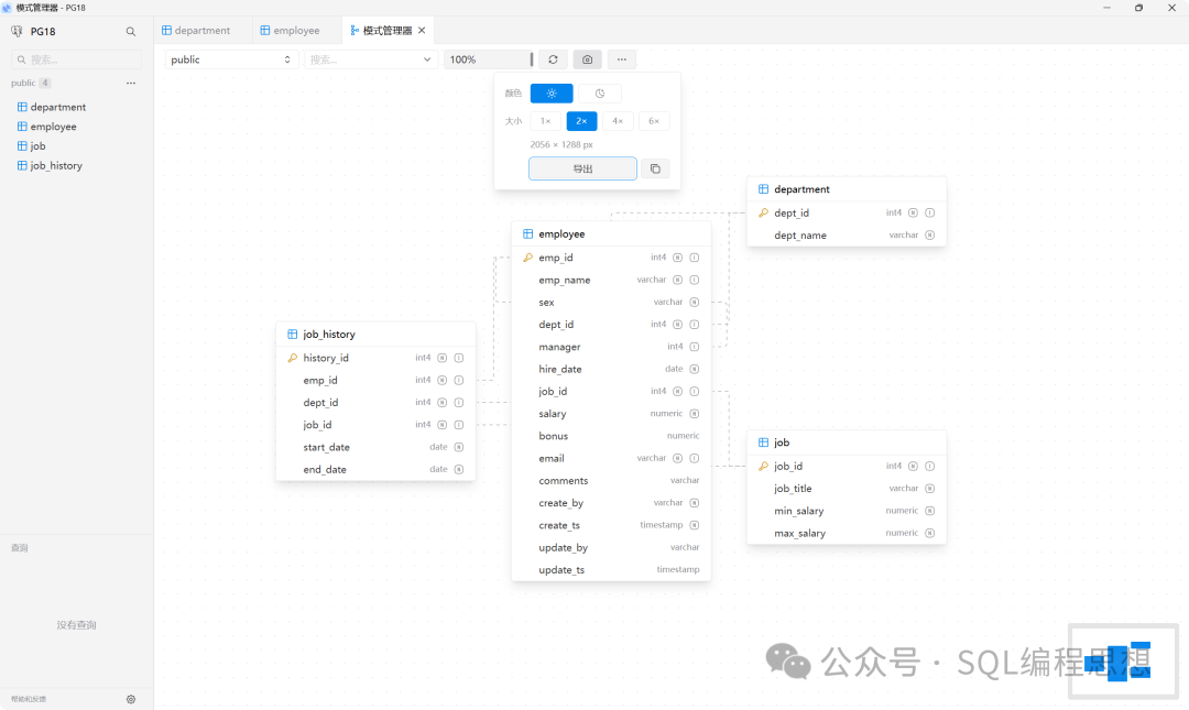 - • 实体关系图:模式管理器可以展示图形化的表结构和关系,支持 DDL 复制以及导出图片功能。