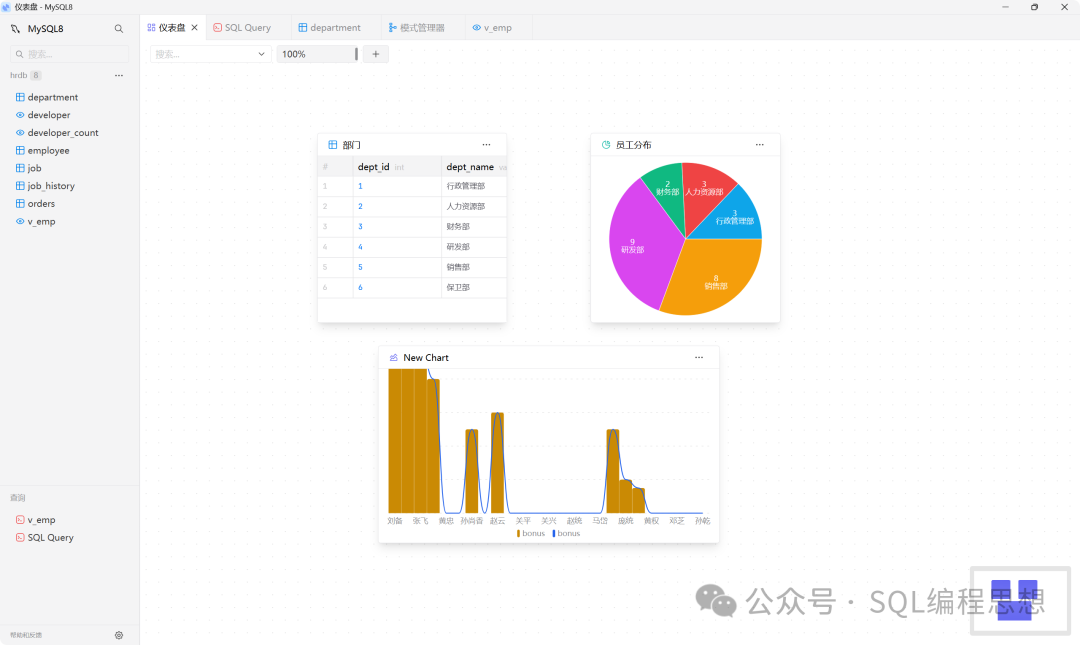 - • 可视化仪表盘:可以通过仪表盘创建可视化的数据图表,包括柱状图、饼图、折线图等。