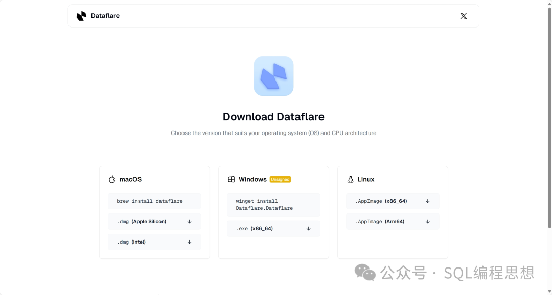 选择对应操作系统的安装文件进行下载,安装完成之后运行 dataflare.exe(Windows):
