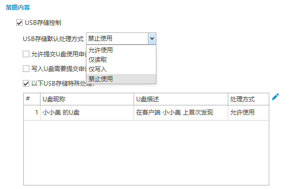 ③禁止接入U盘+禁用USB接口 管控使用U盘的权限,全部禁止或者是只允许使用公司安全U盘,禁止一切陌生或私人U盘使用,防止乱用U盘导致病毒感染。除了U盘以外,还可以做到管控所有外接设备接入。
