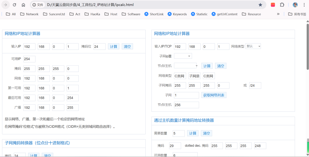 附件:IP地址计算.zip工具介绍网络和IP地址计算子网掩码转换计算二进制/十进制/十六进制转换主机数量计算使用方法1、下载压缩包,解压出来,双击“ipcalc.html”文件,会自动从浏览器打开。建议:可将“ipcalc.html”文件右键“发送到桌面”,后续使用直接在桌面打开更快捷;在浏览器打开“ipcalc.html”工具后,也可以添加到书签栏。