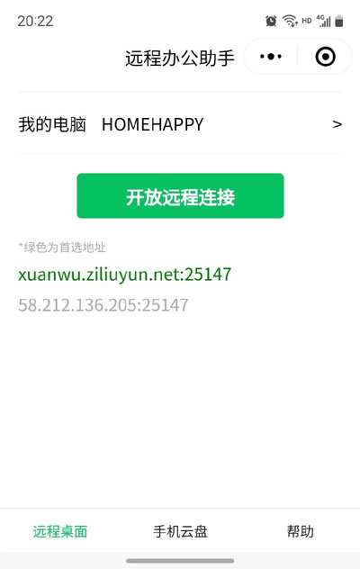 为保证用户安全,远程桌面对公网接口默认是关闭状态。在微信小程序中点击“开放远程连接”后才能连接: