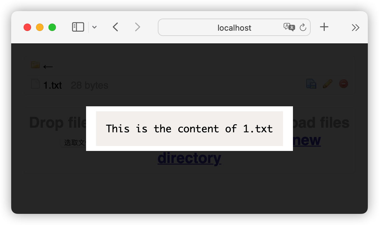 其中 http://localhost:80/public-writable 是 public-writable 服务,映射了本地的 ./data/public-writable 文件夹。它是无用户验证的、可写的。可以在浏览器中查看文件内容,也可以进行上传、删除等操作。
