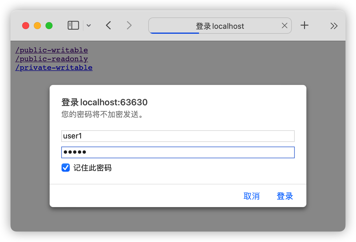 http://localhost:80/private-writable 是 private-writable 服务,映射了本地的 ./data/private-writable 文件夹。它是有用户验证的、可写的。在使用 user1 和 pass1 登录以后,可以在浏览器中查看文件内容,也可以进行上传、删除等操作。