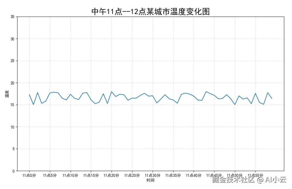 plt.title("中午11点--12点某城市温度变化图", fontsize=20)