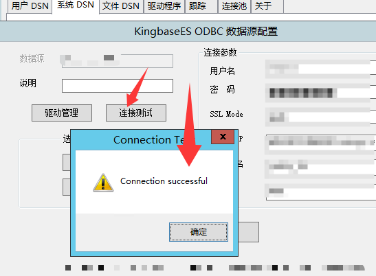先通过ODBC连接测试。前往控制面板-管理工具-ODBC数据源64位-系统DSN,点击“连接测试”按钮,若提示“Connection successful”说明连接成功,若提示其他信息,则需要找提供右侧连接信息的人来确认是否正确。
