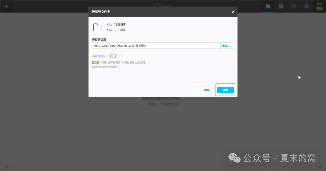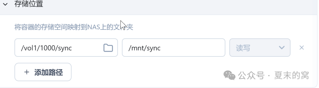 安装的时候记得将容器目录映射到NAS上,不然同步的文件找不到。参考下图