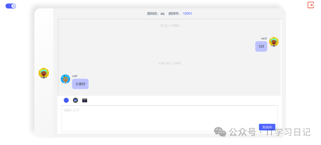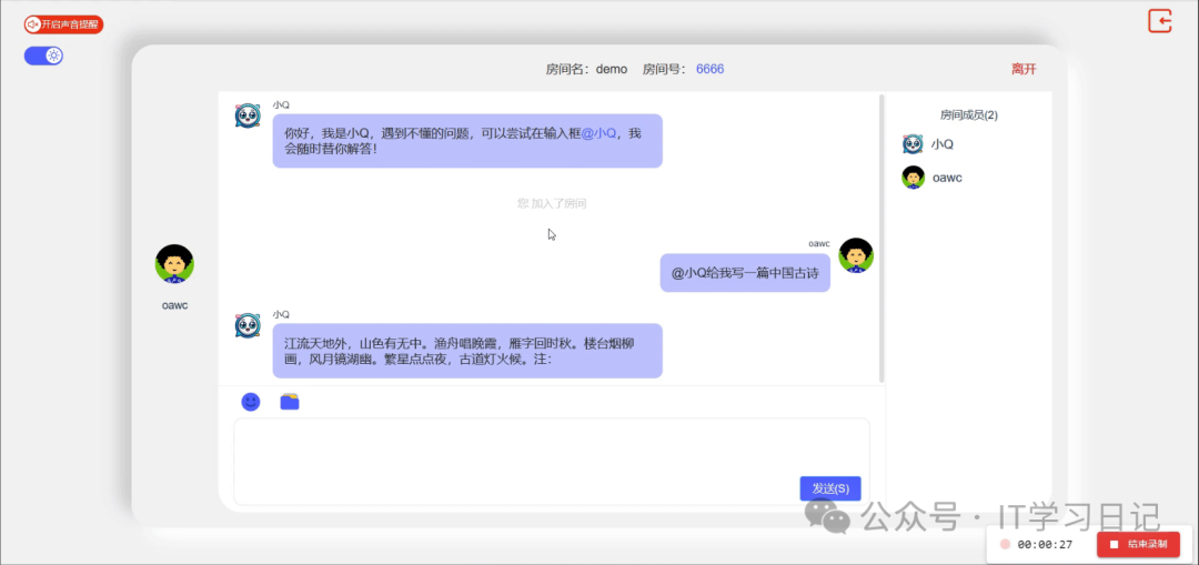 • 消息通知机制: 支持实时消息提醒、成员加入或退出房间时自动通知