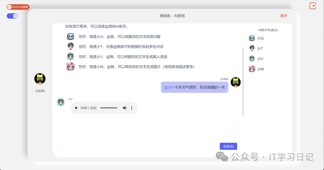 系统集成了AI功能,对接了市面上的主流AI大模型,可实现各样式的文本对话、文本转语音、文本转图像,给用户提供更智能的体验。系统采用的前后端架构设计,代码100%开源,支持私有化部署,可广泛应用于社交平台、语聊、匿名房间、AI助手等场景。