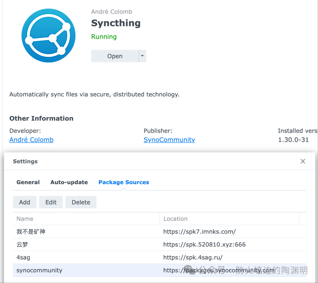 - • 可以直接在套件中心安装 Syncthing(部分型号需使用第三方套件源)。