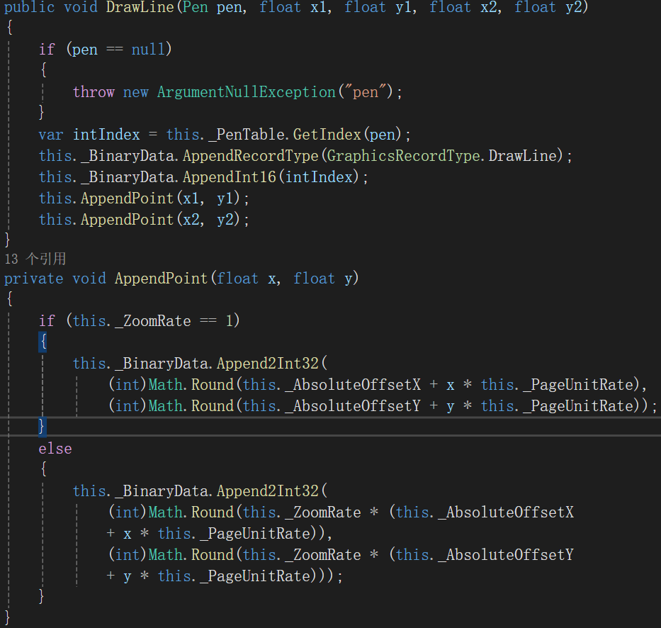 在这个函数中,程序首先获得int16数据,这是画笔对象编号,从this.PenTable中获得画笔对象。然后使用DrawLine函数来绘制线段。这里调用了4次ReaderInt32(),这是获取线段的坐标信息,也就是x1,y1,x2,y2。