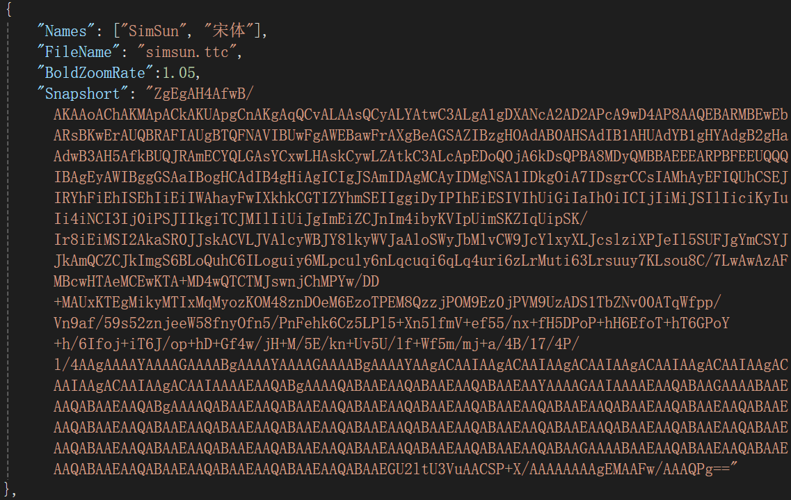 2.将字符的Uncode编码根据相同的字符宽度来划分区域,以此将这些宽度数值高度压缩为“字体快照信息”。例如宋体字体文件simsun.ttc有18MB大小,由于是等宽字体,其快照信息仅 1KB。