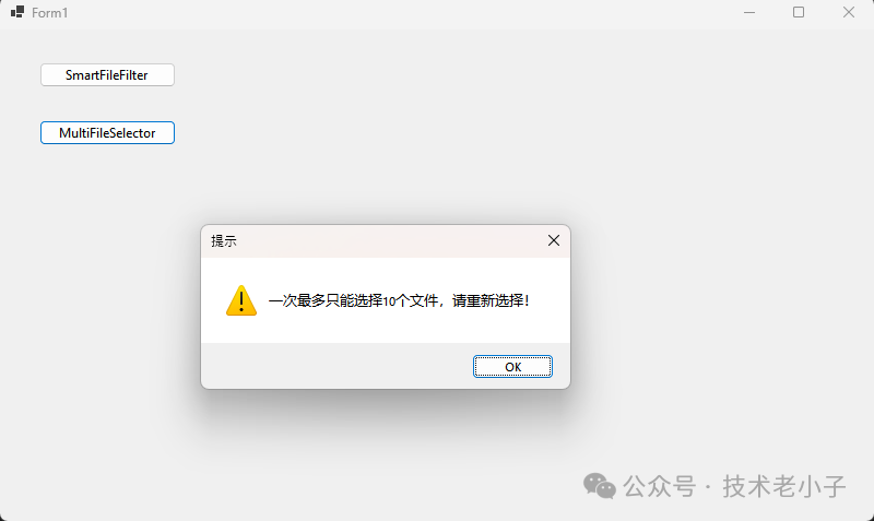 MessageBox.Show("一次最多只能选择10个文件,请重新选择!", "提示",
