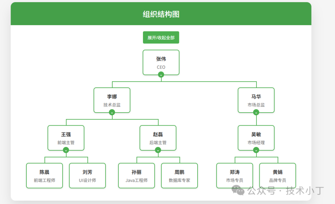 本项目呈现了一个典型的公司组织架构,从上级开始逐层向下展示各个部门及员工职位。用户可以通过点击节点上的 +/- 按钮来展开或收起子节点,也可以通过顶部的“展开/收起全部”按钮一键控制所有节点的状态。默认情况下,部分节点被设置为收起状态以避免图表过于庞大,用户可以根据需要自由展开查看详细信息。
