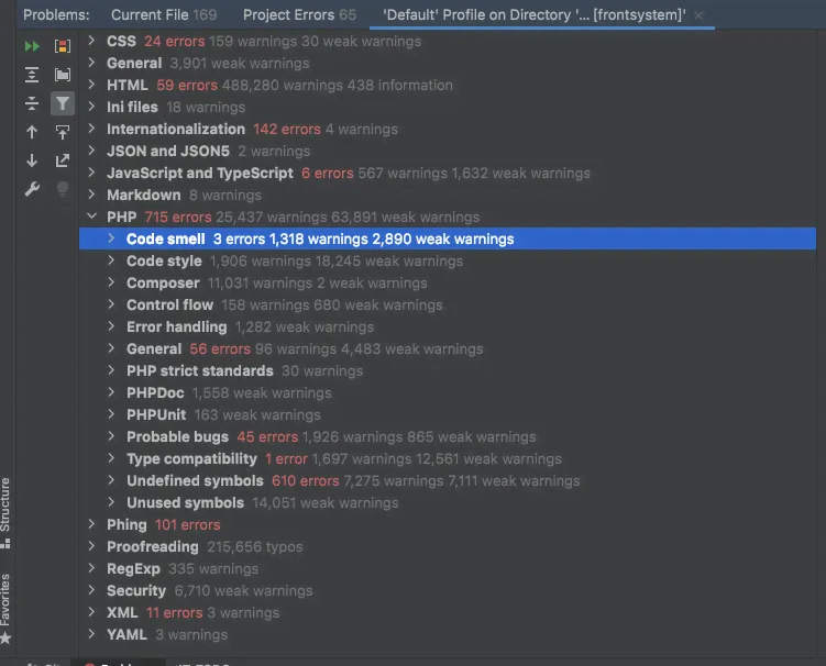 代码复杂度分布图使用静态分析代码整体的项目后的 PHP 错误数高达715处,警告数达到25000+,说明了历史代码的存在诸多问题。