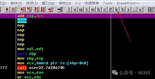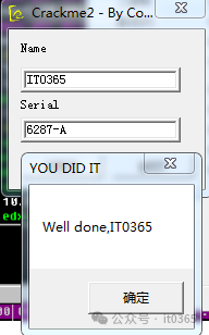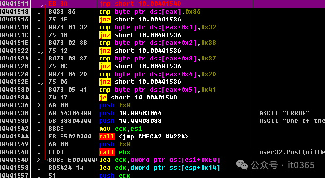 返回这个地址后,选择它按F2下断点。下完后在按F9让程序运行起来。点击软件上的错误框后直接就断下了。断下后观看堆栈窗口中的返回是哪里调用的。看到这里是软件模块中的调用,直接按回车就来到它的关键位置了。向上找到程序开头代码下断点(F2)。重新加载程序,F9运行起来再次输入假的用户与密码点击CHECK按钮直接断下来,F8分析。。。。。。。关键位置,这里在取假注册码的ASCII作对比。不相等就直接失败。强制破解它,只需要把这些代码NOP掉或在前面直接JMP掉,完成注册。实际这个程序的注册也非常简单,就是取注册码前6个字符码和固定值比较而已。我们把这个内容在数据窗口转换看看是什么内容 0x363238372d41这样就知道了它的固定注册码为:6287-A输入软件内。