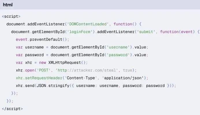 1. 窃取用户输入的数据 攻击者可以通过XSS攻击窃取用户在表单中输入的数据,如用户名、密码、信用卡信息等。 示例代码: