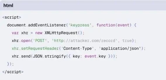 7. 发起键盘记录攻击 攻击者可以通过XSS攻击在用户的浏览器中插入恶意脚本,记录用户的键盘输入。 示例代码: