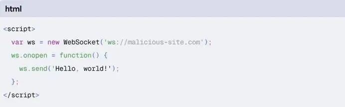 10.发起WebSockets攻击 攻击者可以通过XSS攻击在用户的浏览器中建立WebSockets连接,发送恶意消息。 示例代码: