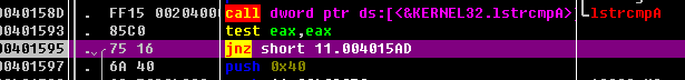 00401585 |> \8D4D E4 lea ecx,[local.7]00401588 |. 51 push ecx ; /String2 = "<BrD-SoB>"00401589 |. 8D55 F4 lea edx,[local.3] ; |0040158C |. 52 push edx ; |String1 = "gzh:it036"0040158D |. FF15 00204000 call dword ptr ds:[<&KERNEL32.lstrcmpA>] ; \lstrcmpA00401593 |. 85C0 test eax,eax00401595 |. 7516 jnz short 11.004015AD00401597 |. 6A 40 push 0x4000401599 |. 6850304000 push 11.00403050 ; ASCII "CrackMe"0040159E |. 6858304000 push 11.00403058 ; ASCII "Correct way to go!!"004015A3 |. 8B4D E0 mov ecx,[local.8]004015A6 |. E8 53050000 call <jmp.&MFC42.#4224>