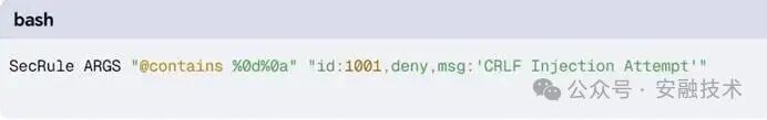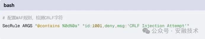 2. 配置WAF规则: • 检测和阻止恶意请求:通过配置WAF规则,检测和阻止包含CRLF字符的恶意请求。 • 示例: