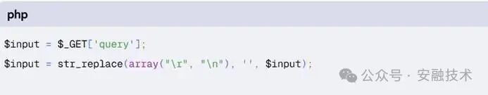 4. 代码审查: • 审查输入处理:检查应用程序代码,确保对用户输入进行了严格的验证和过滤,特别是对CRLF字符的处理。 • 示例: