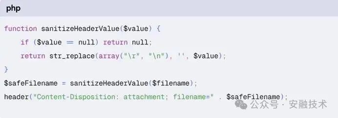 4. 安全配置: • 限制响应头:限制应用程序可以设置的响应头,避免注入额外的响应头。 • 示例: