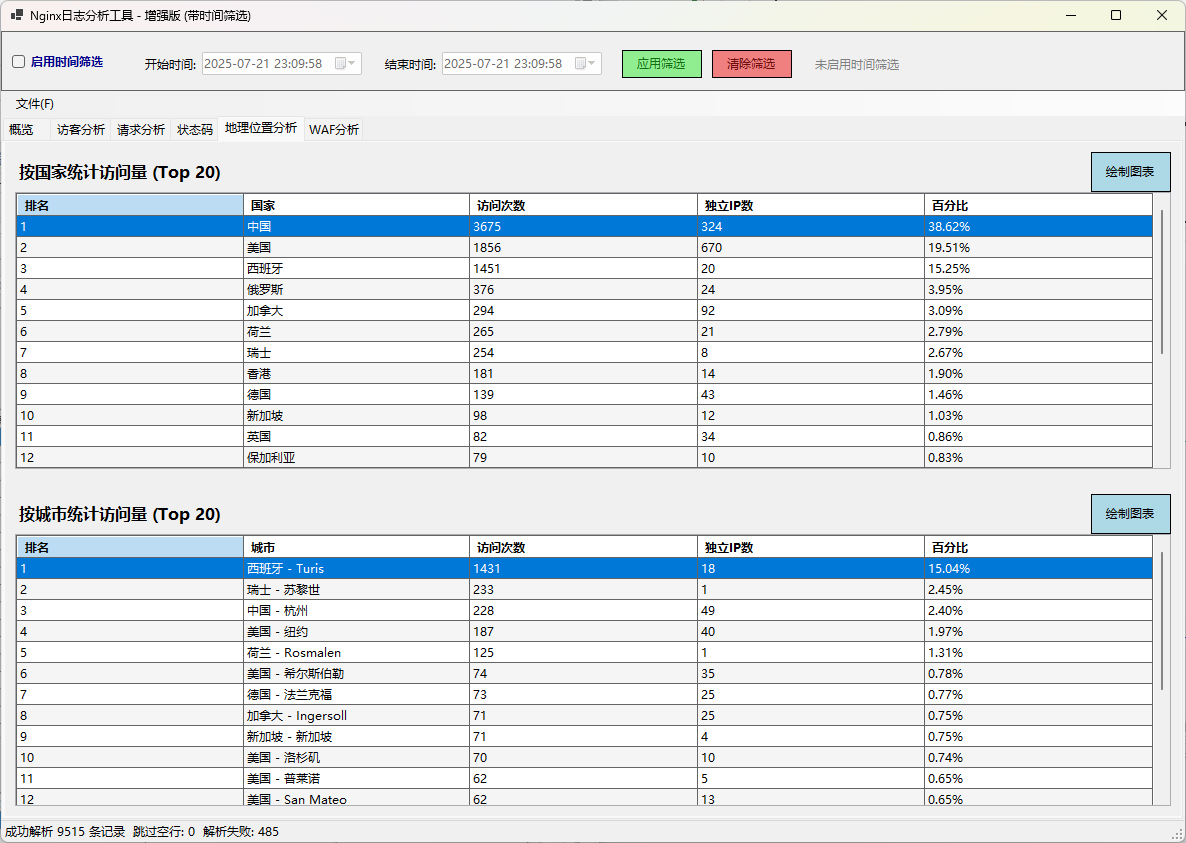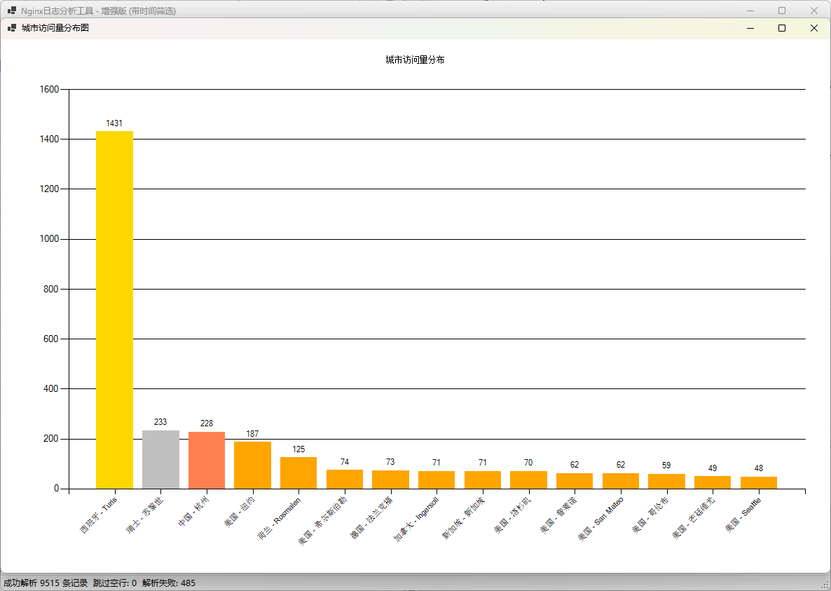 一个功能强大的Nginx日志分析工具,基于C# WinForms开发,支持全面的访问日志分析、地理位置统计、Web攻击检测和时间筛选功能。