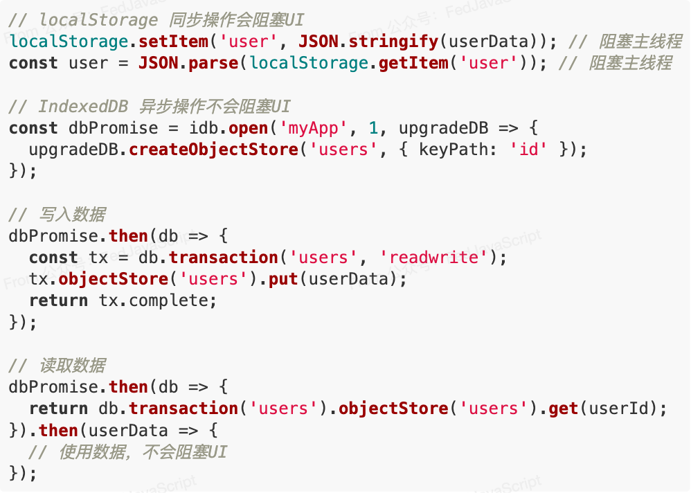 IndexedDB:现代前端存储的王者IndexedDB 是一个面向对象的数据库系统,专为大量结构化数据的客户端存储而设计。它解决了 localStorage 的所有核心痛点,并提供了更多高级功能: 1. 异步操作,性能更优与 localStorage 的同步操作不同,IndexedDB 采用异步 API,所有操作都不会阻塞主线程: