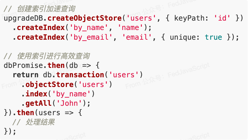 4. 强大的查询与索引能力与 localStorage 的简单键值对不同,IndexedDB 提供了类似数据库的高级特性: