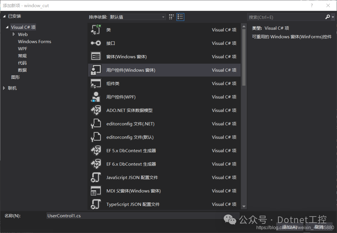 2、新建用于在主窗体中显示的子窗体,子窗体的新建其实是一个用户控件(Windows窗体),在这里我们可以在状态栏中右击选择—>添加—>用户控件(Windows窗体)