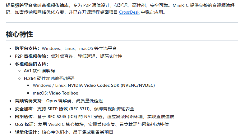作为一款实验性应用,它背后依赖的MiniRTC技术库提供了包括网络穿透、视频编解码、音频处理、传输加密等核心功能,确保了远程控制的流畅性和安全性。 主要特点跨平台支持 CrossDesk支持主流的操作系统:
