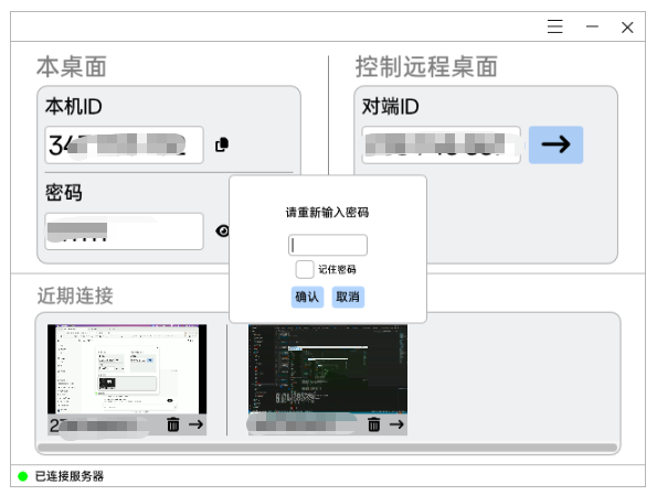 在控制端的“对端ID”处输入远程桌面的ID,点击箭头发起连接