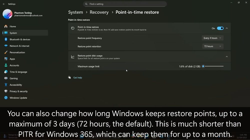 微软最新开发的功能名为时间点还原,该功能与系统还原功能类似但不清楚是全新开发的还是复用了系统还原的某些功能,目前从演示来看与系统现有的还原功能非常相似。