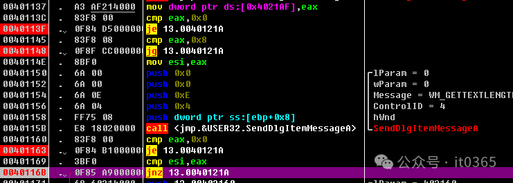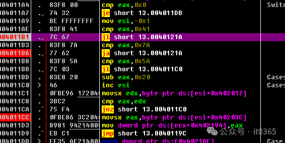 由这里可以判断的数字转成字母得出用户名只能是大小写字母。将用户名修改下继续分析。004011A4 . 83F8 00 cmp eax,0x0 ; Switch (cases 0..7A)004011A7 . 74 32 je short 13.004011DB004011A9 . BE FFFFFFFF mov esi,-0x1004011AE . 83F8 41 cmp eax,0x41004011B1 . 7C 67 jl short 13.0040121A004011B3 . 83F8 7A cmp eax,0x7A004011B6 . 77 62 ja short 13.0040121A004011B8 . 83F8 5A cmp eax,0x5A004011BB . 7C 03 jl short 13.004011C0004011BD . 83E8 20 sub eax,0x20 ; Cases 5A ('Z'),5B ('['),5C ('\'),5D (']'),5E ('^'),5F ('_'),60 ('`'),61 ('a'),62 ('b'),63 ('c'),64 ('d'),65 ('e'),66 ('f'),67 ('g'),68 ('h'),69 ('i'),6A ('j'),6B ('k'),6C ('l'),6D ('m')... of switch 004011A4004011C0 > 46 inc esi ; Cases 41 ('A'),42 ('B'),43 ('C'),44 ('D'),45 ('E'),46 ('F'),47 ('G'),48 ('H'),49 ('I'),4A ('J'),4B ('K'),4C ('L'),4D ('M'),4E ('N'),4F ('O'),50 ('P'),51 ('Q'),52 ('R'),53 ('S'),54 ('T')... of switch 004011A4004011C1 . 0FBE96 172040>movsx edx,byte ptr ds:[esi+0x402017]004011C8 . 3BC2 cmp eax,edx004011CA .^ 75 F4 jnz short 13.004011C0004011CC . 0FBE86 3C2040>movsx eax,byte ptr ds:[esi+0x40203C]004011D3 . 8981 94214000 mov dword ptr ds:[ecx+0x402194],eax004011D9 .^ EB C1 jmp short 13.0040119C004011DB > FF35 AF214000 push dword ptr ds:[0x4021AF] ; Case 0 of switch 004011A4004011E1 . 68 94214000 push 13.00402194 ; ASCII "8DFF0F7"004011E6 . 68 79214000 push 13.00402179 ; ASCII "12345678"004011EB . E8 54000000 call 13.00401244