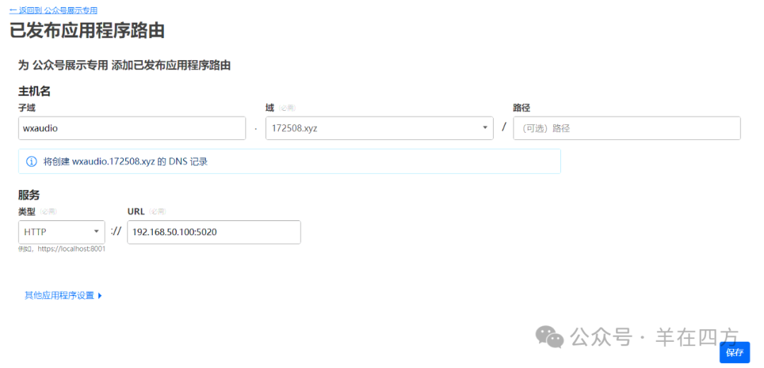 这里以我之前制作的下载微信公众号音频的小工具为例: * 子域名**:`wxaudio` * 域名**:选择你托管的 `172508.xyz` * 服务类型/URL:填写你NAS服务的内部地址,如我的 `http://192.168.50.100:5020`