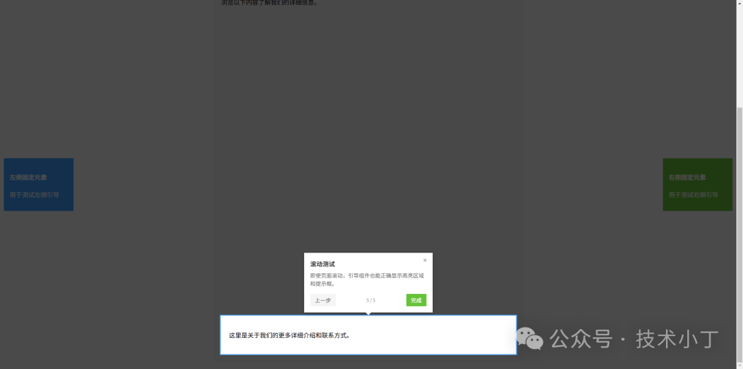页面主要包含以下区域:引导按钮、内容卡片、超出页面的元素区域和边缘元素区域。引导组件启动时会由 JavaScript 生成覆盖层、高亮区域和提示框。<button id="startGuide" class="btn">开始引导</button>
