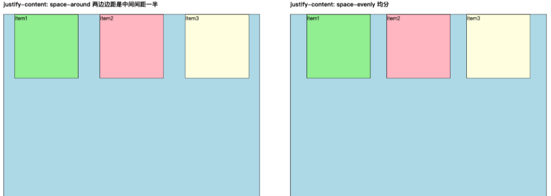 space-evenly:每个项目两侧的间隔完全相等。