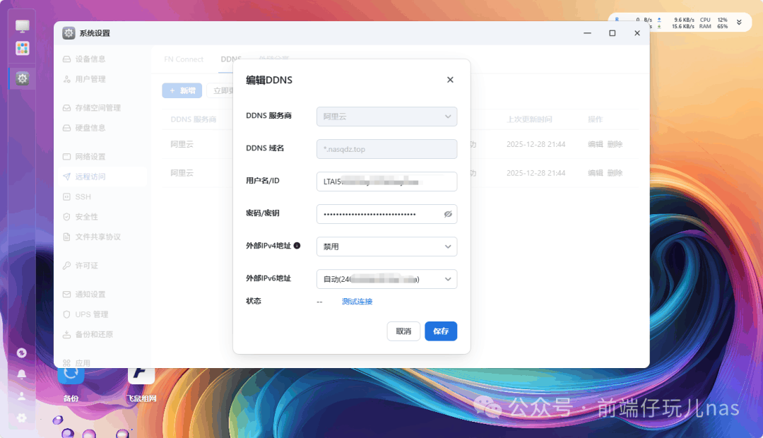 如何查看是否有IPV6呢?📱如图IPV6带有网关地址以及DNS地址的,那就是没问题的。 ![]() 开始实战原理其实就是让阿里云ESA使用IPV6回源我们相应的地址。 配置DDNS前端仔这里新购的域名,然后禁用了IPV4,只解析IPV6地址。 ![]() 通过域名+端口是能够访问到,说明DDNS已经生效了。 ![]() 配置ESA![]() 🥊 接入方式这里我们选择CNAME。与之前文章有点不同。 ![]() 🪀 手动将DNS记录添加到域名服务商处。(前端仔这里是阿里云的域名) ![]() 🎮 站点添加成功以后,进入站点添加一条DNS记录。 这里 ![]() 🔫 添加以后同样需要在域名服务商处添加DNS记录。 ![]() 添加一条回源规则,更改回源端口,这里我们填写上飞牛的端口。 ![]() 效果展示📛 前端仔为了方便,直接关闭了电脑的IPV6网络。 ✅ 使用域名访问,成功! ❓:访问速度怎么样? ✅:大家都很关心访问速度,没有备案的域名,个人而言,我能接受。备案后的域名,速度像坐火箭! ❓:使用ESA的前提是什么? ✅:需要一个域名以及拥有公网IP(IPV6即可)。 ❓:回源规则只能填5个怎么办? ✅:机器自己部署一个nginx、caddy或者lucky等web服务做反向代理,回源规则配置在这些服务开放的端口上。 阅读原文:原文链接 该文章在 2025/12/31 10:34:16 编辑过 |