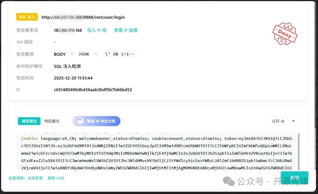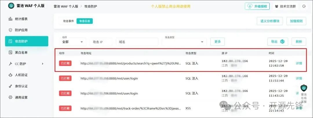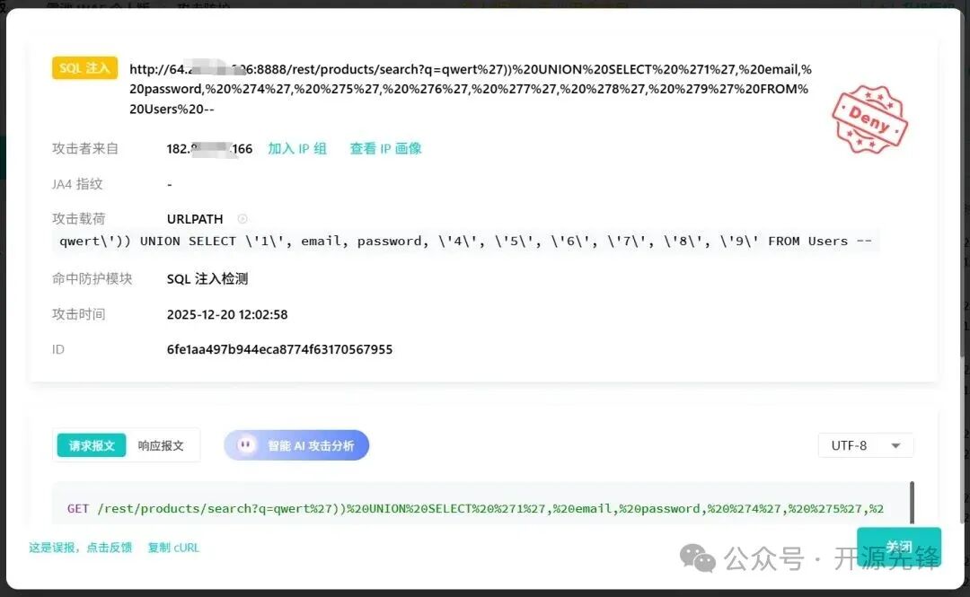 我们来到雷池管理后台,从攻击日志中可以看到刚刚这笔被拦截的攻击记录 以及具体详细信息 场景2:API 接口直接“拖库”,数据被窃取如果说第一个场景是“闯进系统”,那第二个场景展示的就是 闯进来之后能拿走什么 。 开源君构建的这个web页面的搜索 API 本身存在 SQL 注入风险。在 3000 端口下,通过构造查询参数,让接口返回的内容不再是商品数据,而是数据库里的真实用户的信息,账号、密码都被扒出来了。