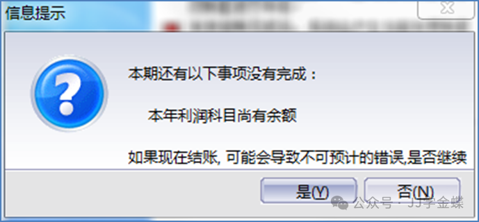 3、标准/迷你版年末结账提示“本期还有以下事项未完成:本年利润科目尚有余额”