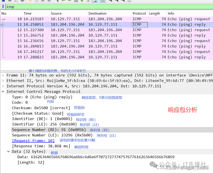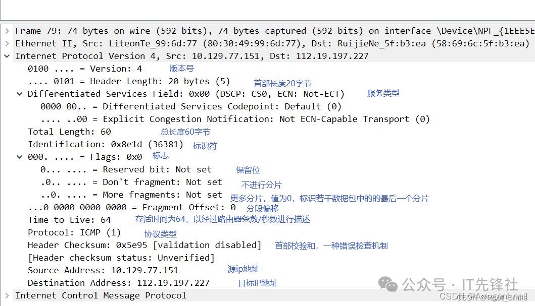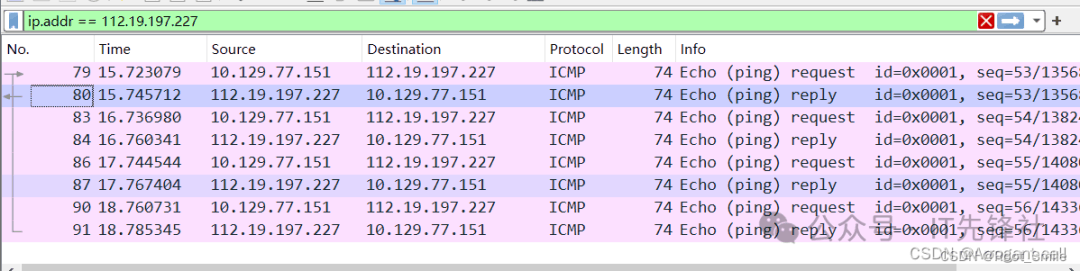 ![]() ![]() ![]() ![]() ![]() ![]() 2.捕获选项设置点击 捕获-->选项,取消勾选“在所有接口上使用混杂模式”,为了方便后续的抓包分析并排除干扰项,您可以选择安装自己所需的网卡,比如WLAN,然后点击确认完成此操作;当然,此步骤并非强制执行,您可以根据个人需求来决定是否执行。 ![]() 3.抓包分析ARP (Address Resolution Protocol)协议,即地址解析协议。该协议的功能就是将IP地址解析成MAC地址。 接下来,我们可以通过命令提示符(cmd)来执行ping操作,向一个指定的IP地址发送数据包。为了便于测试网络的连通性,我们通常建议选择同一局域网内的IP地址进行测试。但在此示例中,为了展示如何使用该命令,我们将以ping www.douyin.com 为例进行操作,具体步骤如下: ![]() Wireshark中arp协议的解析: ![]() ![]() ![]() ![]() 4.IP协议抓包分析互联网协议IP是Internet Protocol的缩写,中文缩写为“网协”。IP协议是位于OSI模型中第三层的协议,其主要目的就是使得网络间能够互联通信。前面介绍了ARP协议,该协议用在第二层处理单一网络中的通信。与与此类似,第三层在功能上承担着跨网络通信地址的管理职责。在这一层级中,多种协议并行工作,其中最为广泛使用且至关重要的协议便是互联网协议(IP)。 ![]() 在Wireshark中,我们已经成功捕获了相当数量的数据包,接下来可以通过应用过滤器 ![]() ip协议抓包分析 ![]() 在所述内容中,Internet Control Message Protocol 通常被称为 ICMP 协议,用于描述相关的协议数据包信息。 ![]() ![]() 5.TCP协议抓包分析TCP (Transmission Control Protocol,传输控制协议)它是一种以连接为导向、具备高度可靠性以及基于IP协议的传输层协议。其核心宗旨在于为数据传输建立可靠的端到端通道。TCP协议在RFC793文档中被详细规定,并且在OSI参考模型中运行于第四层。该协议不仅能够有效管理数据的传输顺序,还能够执行错误恢复机制,最终确保数据能够准确无误地送达目的地。但是,该协议的过程比较复杂。 TCP三次握手 ![]() 1.第一次握手 (1)服务器收到了客户端的请求,向客户端回复一个确认信息(Ack=x+1)。 3.第三次握手 TCP四次挥手 ![]() 为了捕获网络数据包,我们首先需要启动Wireshark软件。如果初始状态下没有数据显示任何数据包,可以通过在浏览器中加载一个网页来触发数据流。例如,可以访问百度首页,点击新闻分类下的某个链接以打开一个新闻页面,随后关闭该页面。此时,在Wireshark中应该能够捕获到大量的网络数据。为了更精确地查看HTTP相关的数据,可以在Wireshark的过滤器栏中输入"http"作为过滤条件。 ![]() 选中一个http记录,右键—>追踪—>tcp流,即可看到一个完整的tcp三次握手。 ![]() 完整的TCP三次握手如下: ![]() TCP协议抓包包分析: ![]() ![]() 第二次和第三次握手的字段内容与第一次握手的字段内容大体一致,主要的差异在于Ack和Seq这两个字段的取值有所不同。 ![]() ![]() ![]() ![]() TCP协议的四次挥手过程与三次握手阶段在基本原理上具有相似性,我们可以利用过滤器 tcp.flags.fin==1 来定位识别出用于发起挥手动作的数据包。 ![]() 为了分析端口号有来有回的数据包,我们将首先监控并捕获这些数据包,然后利用过滤器 tcp.port==50788 对捕获到的数据包进行筛选,最终目的是找出并识别出完整的四次挥手过程。 ![]() 6.UDP协议抓包分析UDP是User Datagram Protocol (用户数据报协议)的简称。它是OSI七层模型中一种无连接的传输层协议,提供面向事务的简单的不可靠信息传送服务。 ![]() ![]() 7.ICMP协议抓包分析ICMP (Internet Control Message Protocol,网际报文控制协议)是Internet 协议族的核心协议之一,它主要用在网络计算机的操作系统中发送出错信息。例如,提示请求的服务不可用、主机或者路由不可达。ICMP协议依靠IP协议来完成其任务,通常也是P协议的一个集成部分。ICMP协议和TCP或UDP协议的目的不同,它一般不用来在端系统之间传送数据。它通常不被用户网络程序直接使用,或者是像Ping 和 tracert这样的诊断程序。 进行抓包,启动Wireshark,通过cmd命令ping一个ip,如ping www.douyin.com。 ![]() 回到Wireshark中利用过滤器输入icmp进行筛选即可,分析如下: ![]() ![]() ![]() ![]()